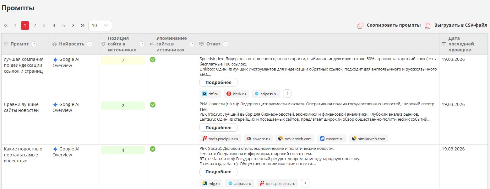 Наш инструмент позволяет проверить, попадает ли ваш сайт в AI-ответы Google, какие страницы используются, и какие конкуренты уже присутствуют в новой выдаче.