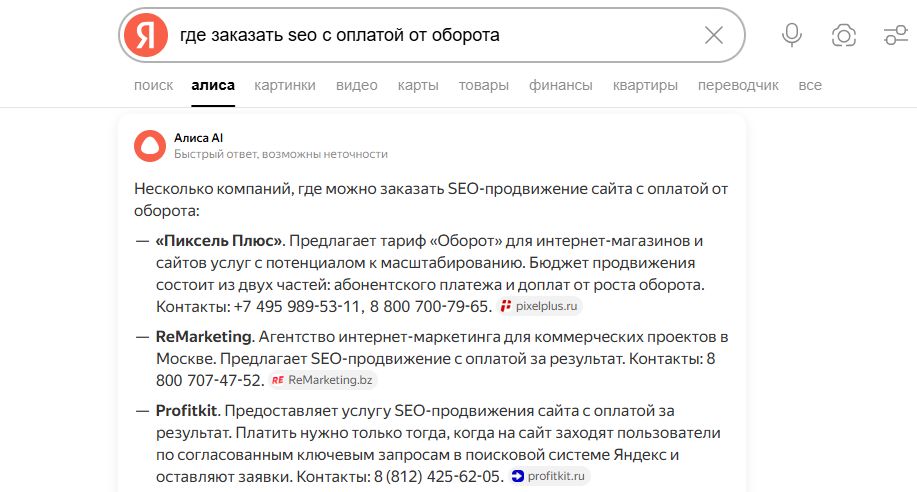 Алиса формирует ответы на базе YandexGPT, используя данные из поиска Яндекса и внешних источников. Однако в отличие от классической выдачи, здесь работают дополнительные фильтры.
