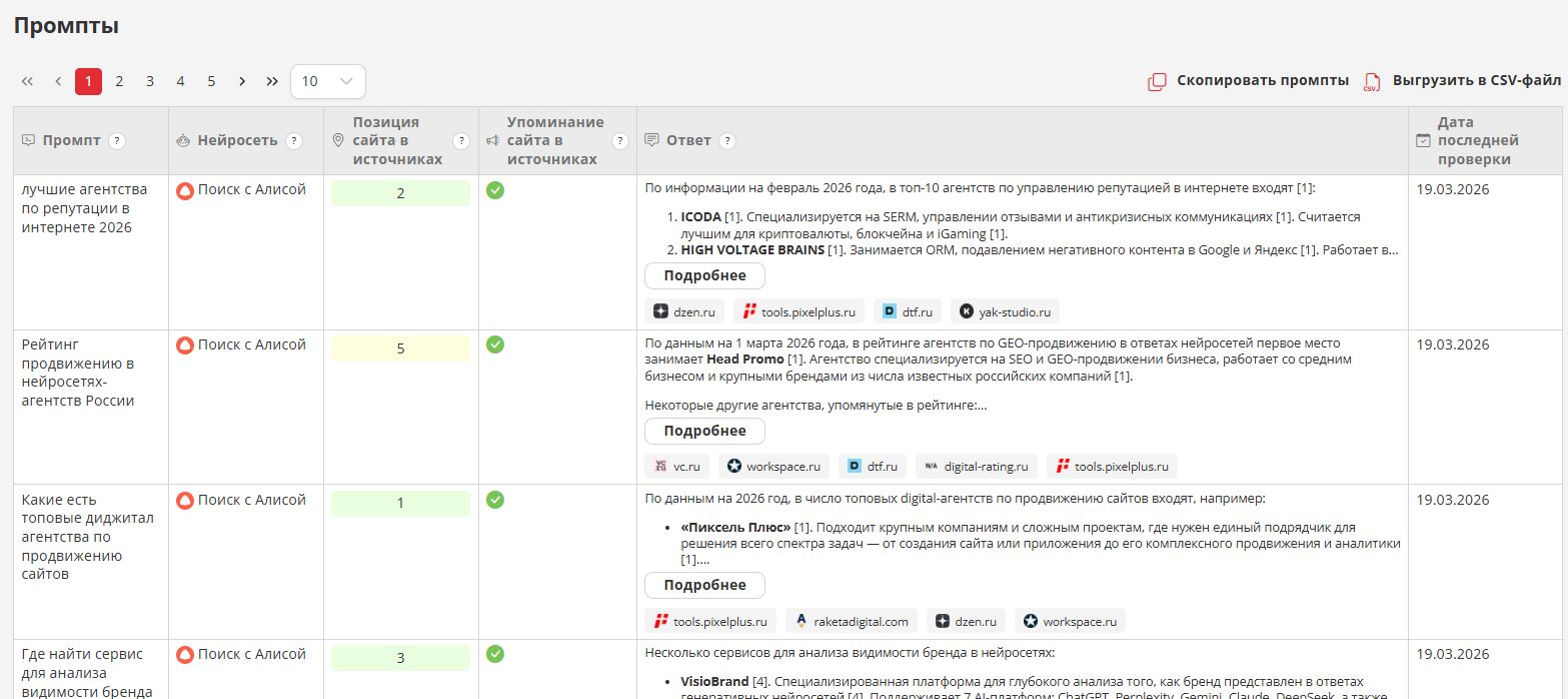 Наш инструмент позволяет проанализировать, как Яндекс Алиса отвечает на запросы вашей тематики, какие сайты она использует как источники и присутствует ли среди них ваш бренд. Это даёт понимание текущей видимости в AI-поиске и точки роста для AI SEO.