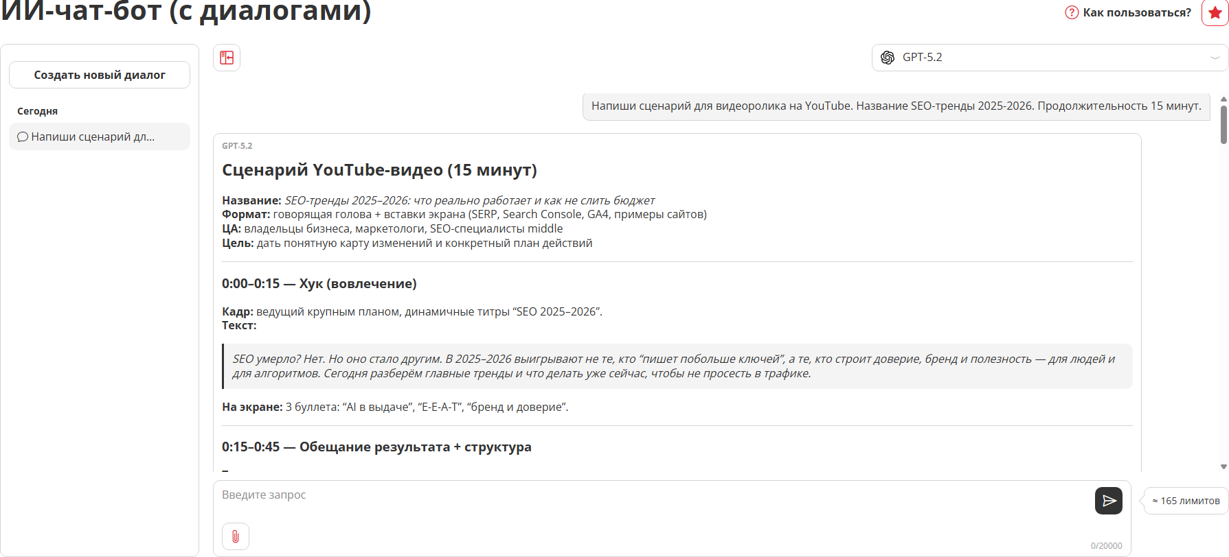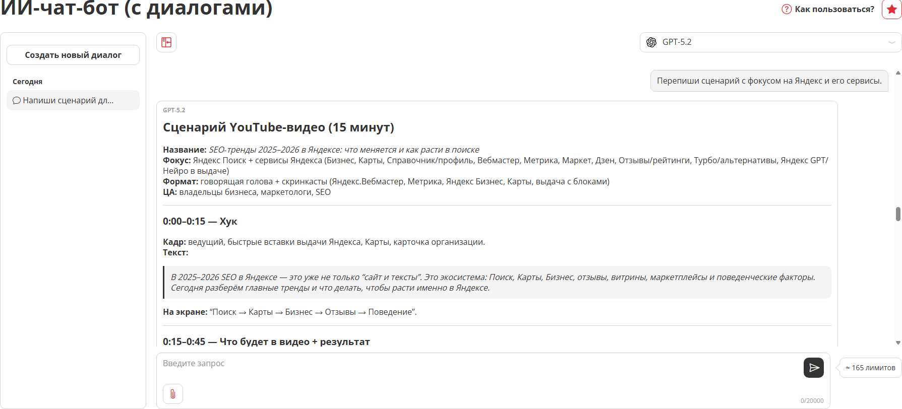 - Если диалог стал слишком длинным и контекст начал теряться, начните новый диалог. Контекст учитывает последние 400 000 символов.