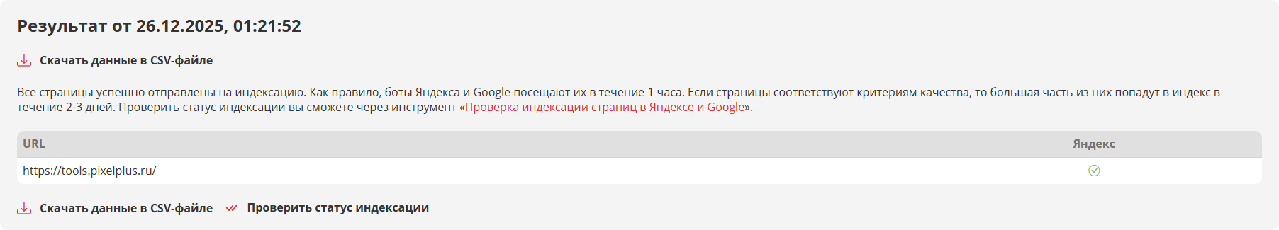 - Если в колонке «Яндекс» или «Google» стоит ✅ — это значит, что URL успешно отправлен на индексацию/переиндексацию. Как правило, бот посещает URL в течение 1 часа, а в индекс большая часть из них попадёт уже в течение 2-3 дней.
