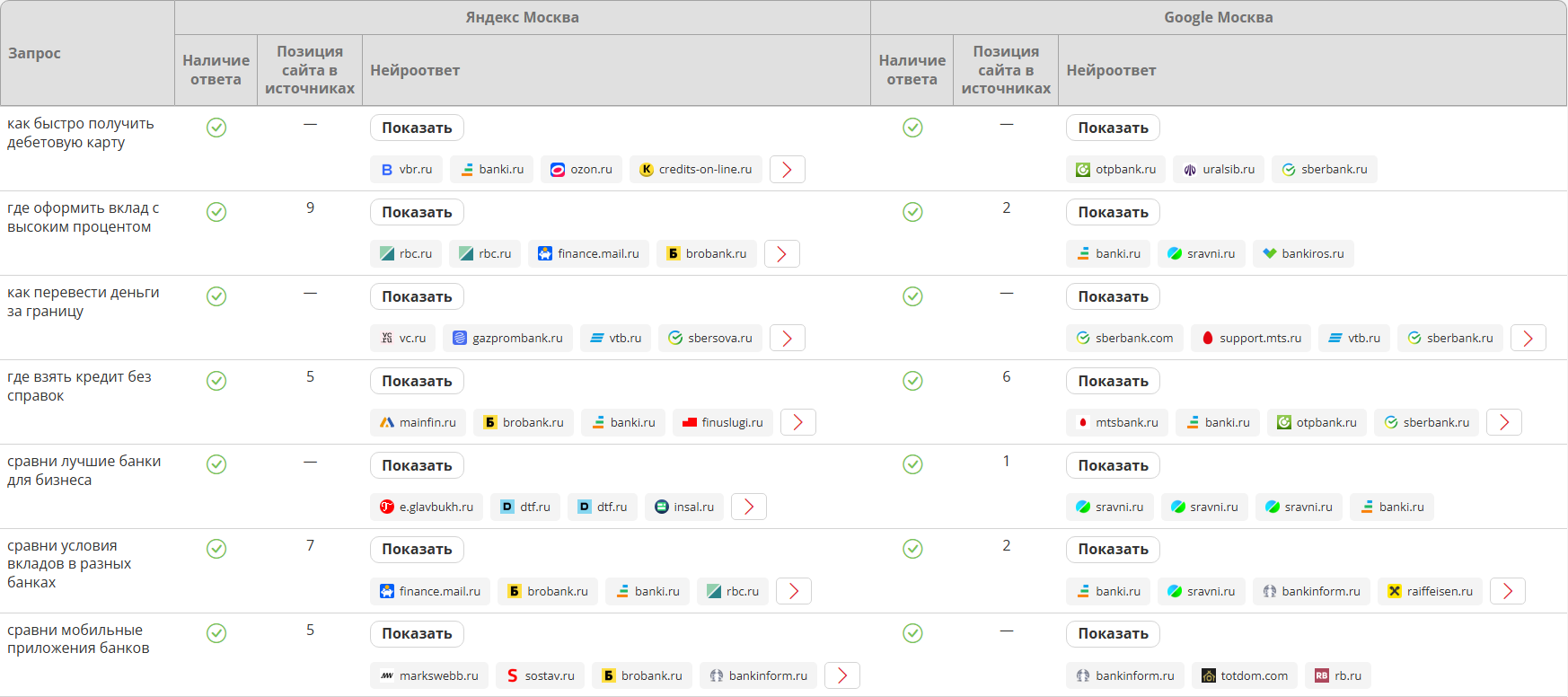 3. Проверка динамики. После публикации и индексации статьи необходимо повторно запустить проверку в инструменте через 2-3 недели. Цель — увидеть, появился ли ваш сайт в списке источников или, в идеале, сместил ли он одного из текущих конкурентов.