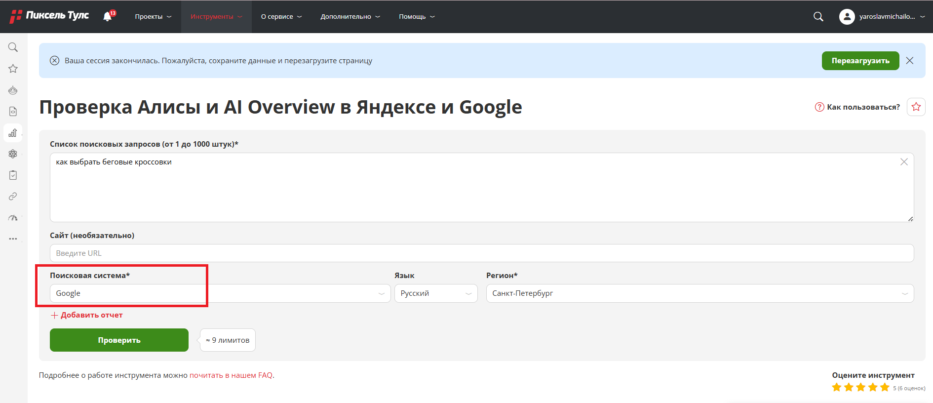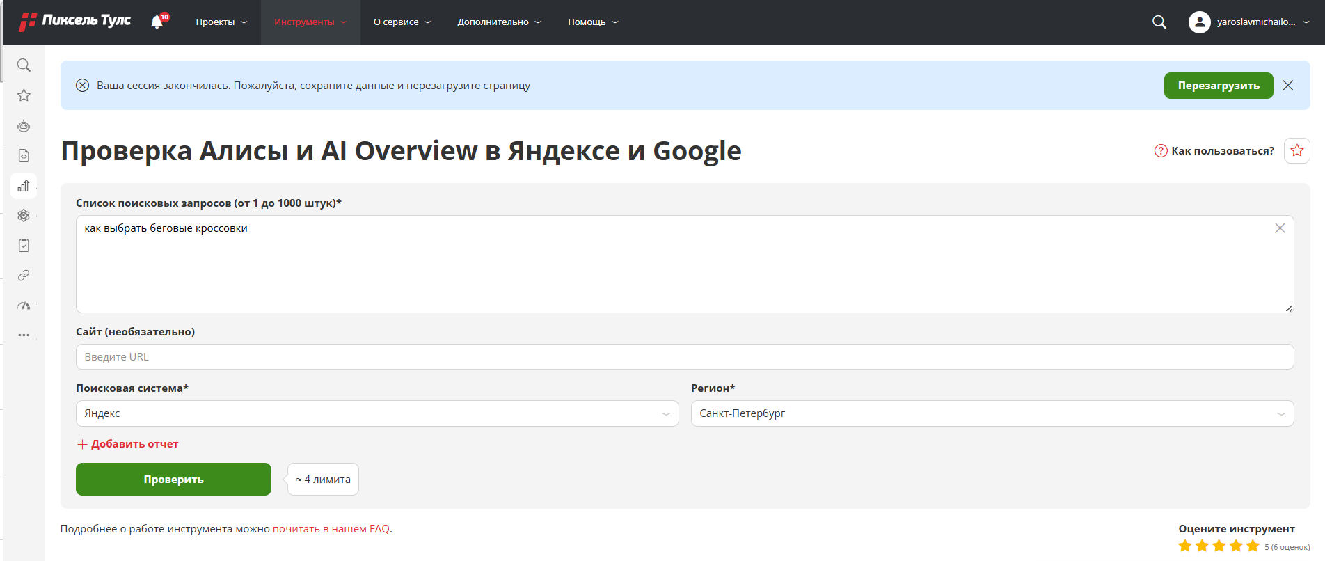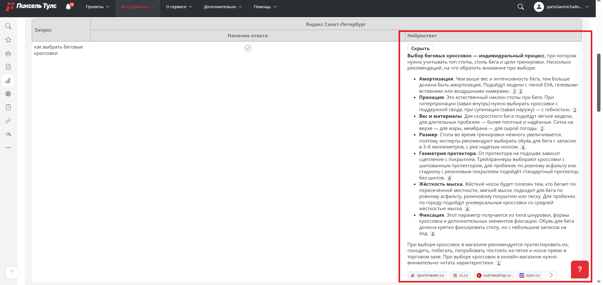 Допустим, вы владеете спортивным магазином и продвигаете запрос «как выбрать беговые кроссовки». Воспользуемся инструментом «Проверка ИИ-ответов в Алисе и AI Overview» от «Пиксель Тулс».