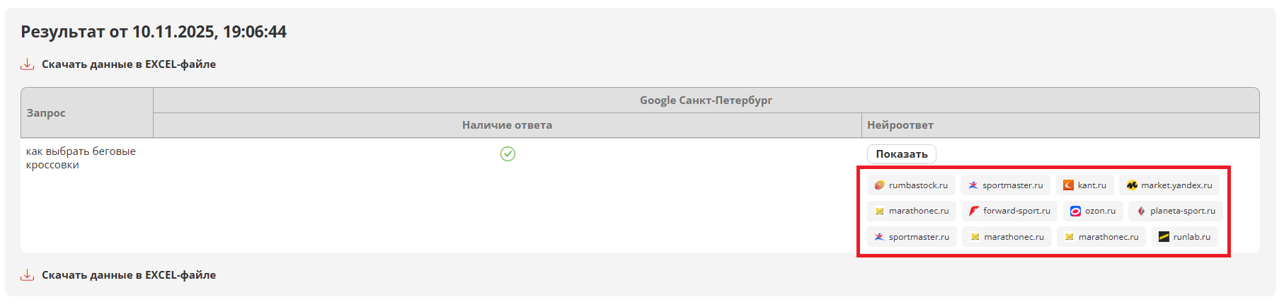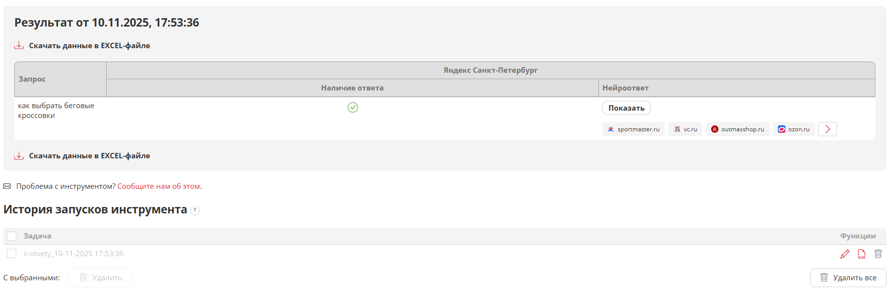 Интерфейс инструмента «Проверка ИИ-ответов». Вы получаете полную картину по каждому запросу в виде удобной таблицы.