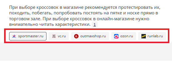 1. Анализ конкурентов. Из результата проверки видно, что нейросеть использует структурированный список критериев. Источники — крупный ритейлер (sportmaster.ru), медиа (vc.ru), онлайн-гипермаркет (ozon.ru) и специализированные магазины. Наша задача — изучить их статьи, чтобы понять, какой контент признан ИИ эталонным. Для этого «проваливаемся» на нужные сайты в списке.