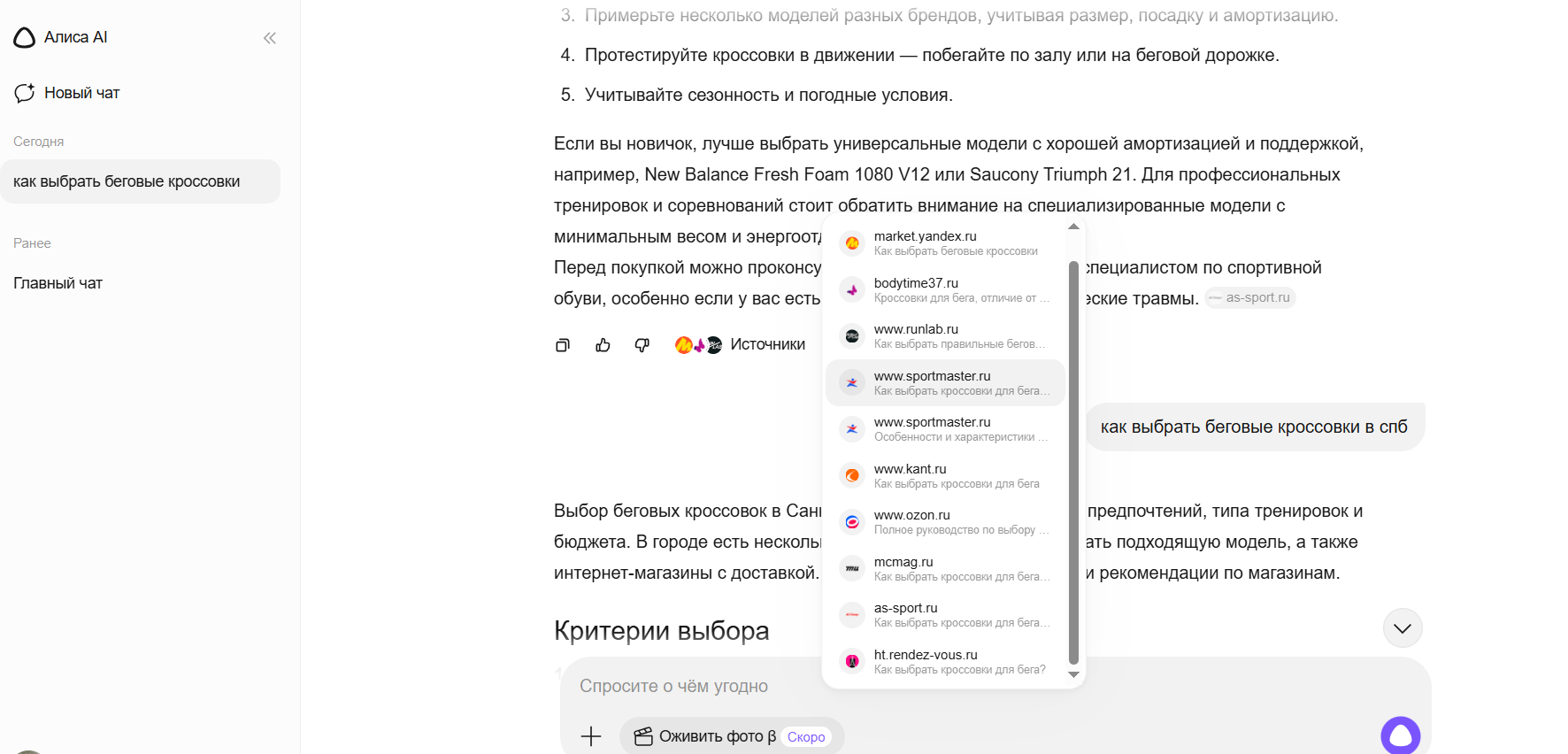 Кстати, вот как выглядят источники по запросу «Как выбрать беговые кроссовки» в Алисе AI от Яндекса: