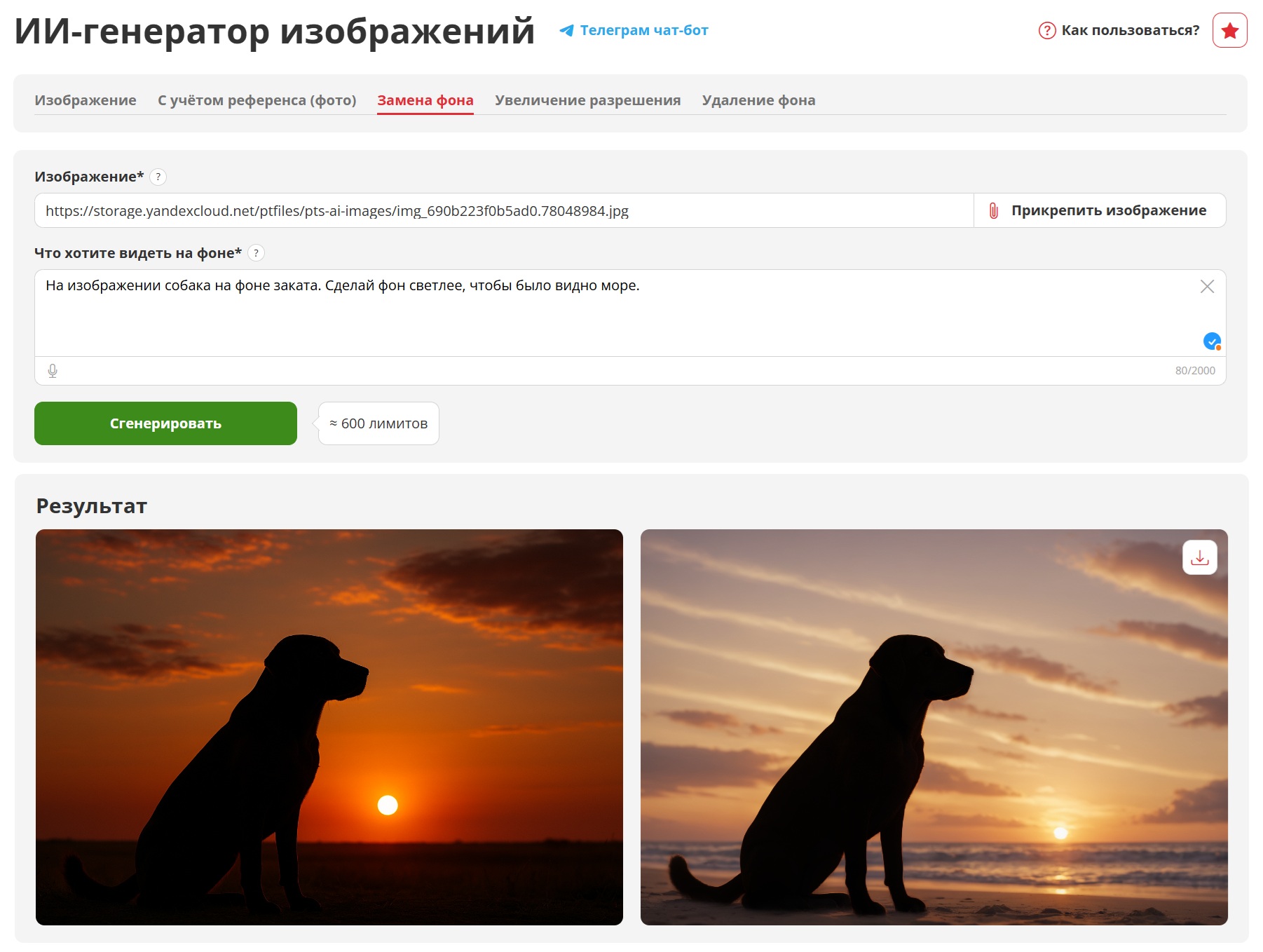 Воспользуйтесь вкладкой «Замена фона», чтобы быстро изменить фон на вашей фотографии или картинке. Загрузите исходное изображение в сервис или укажите ссылку на него. В поле «Что хотите видеть на фоне» опишите желаемый результат — стиль, цветовую гамму, освещение и другие детали. Выберите соотношение сторон, после чего нажмите кнопку «Сгенерировать», чтобы заменить фон и получить готовое изображение.