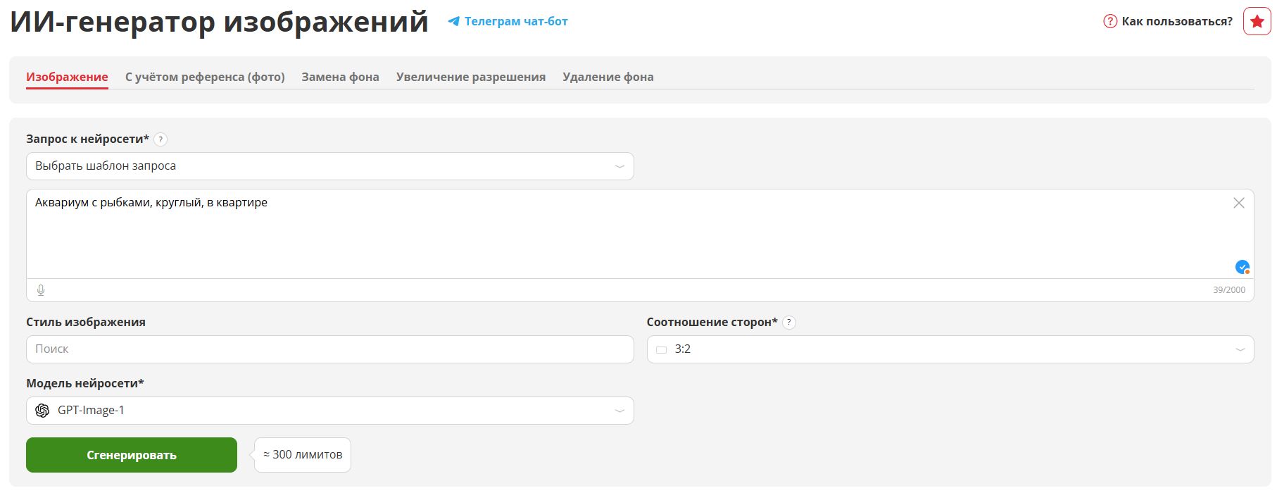 Инструмент доступен в платных тарифах. При каждой генерации списывается около 300 лимитов (зависит от выбора ИИ — Leonardo AI, Dall-E 3 и другие).