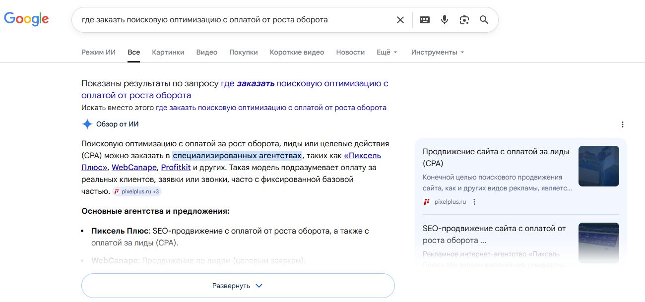 Также можно определить темы, по которым сайт пока не попадает в AI-ответы, и подготовить новые материалы, которые будут закрывать эти запросы. Такой подход помогает постепенно увеличивать вероятность появления сайта в ответах нейросетей.