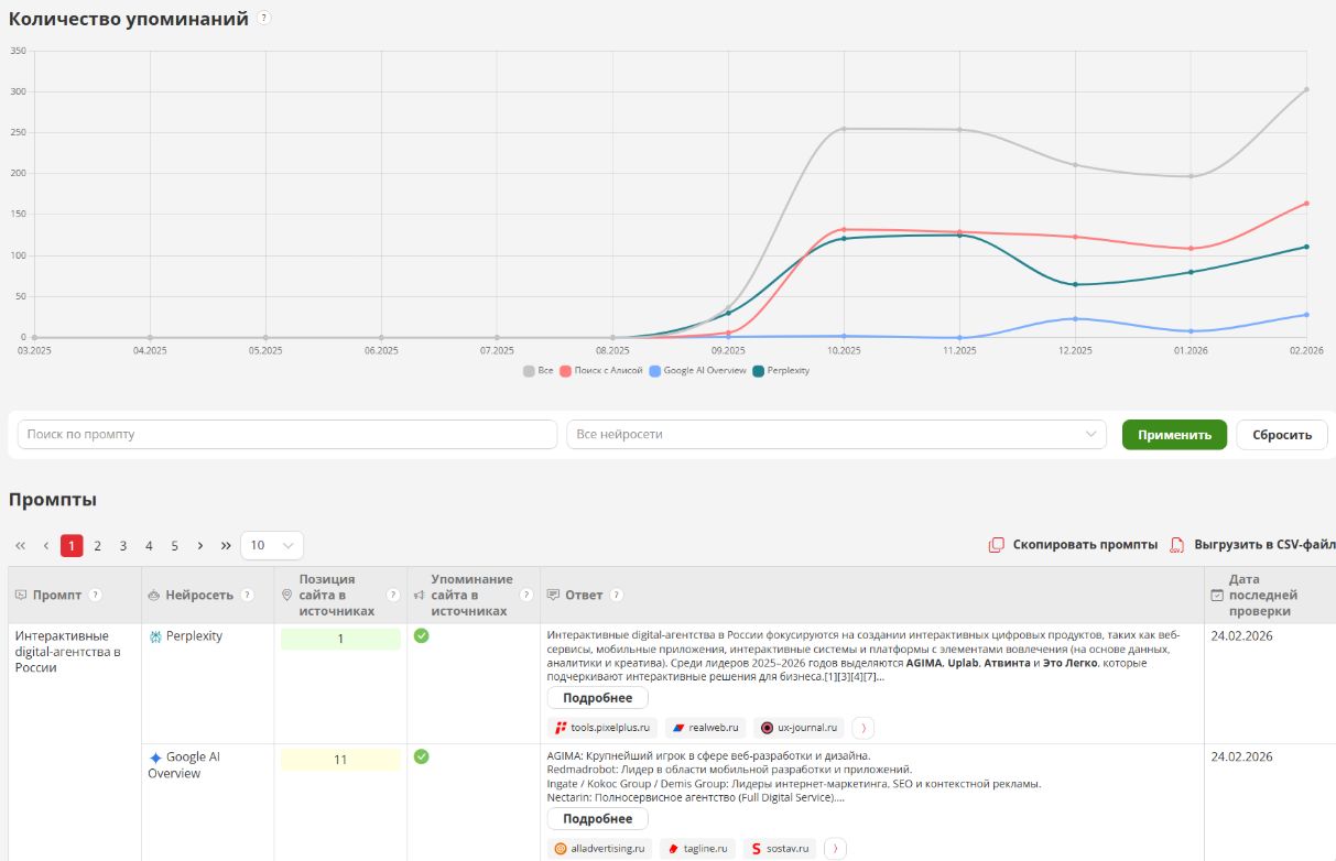 Такая аналитика помогает понять, какие действия влияют на рост присутствия сайта в AI-поиске и какие темы стоит развивать.