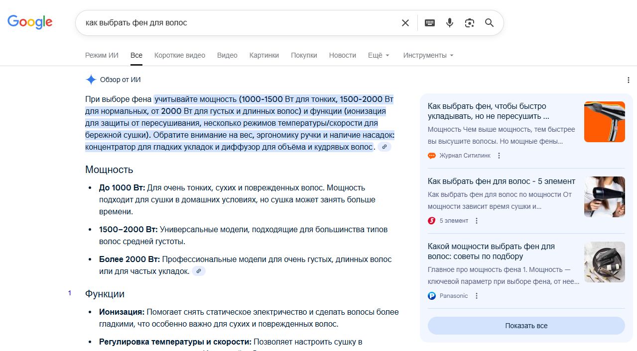 Попадание в ИИ-ответы обеспечивает «нулевой клик» — пользователи видят информацию прямо в выдаче. Это повышает видимость бренда, укрепляет доверие и может компенсировать часть потерь органического трафика, связанных с уменьшением переходов на сайт.